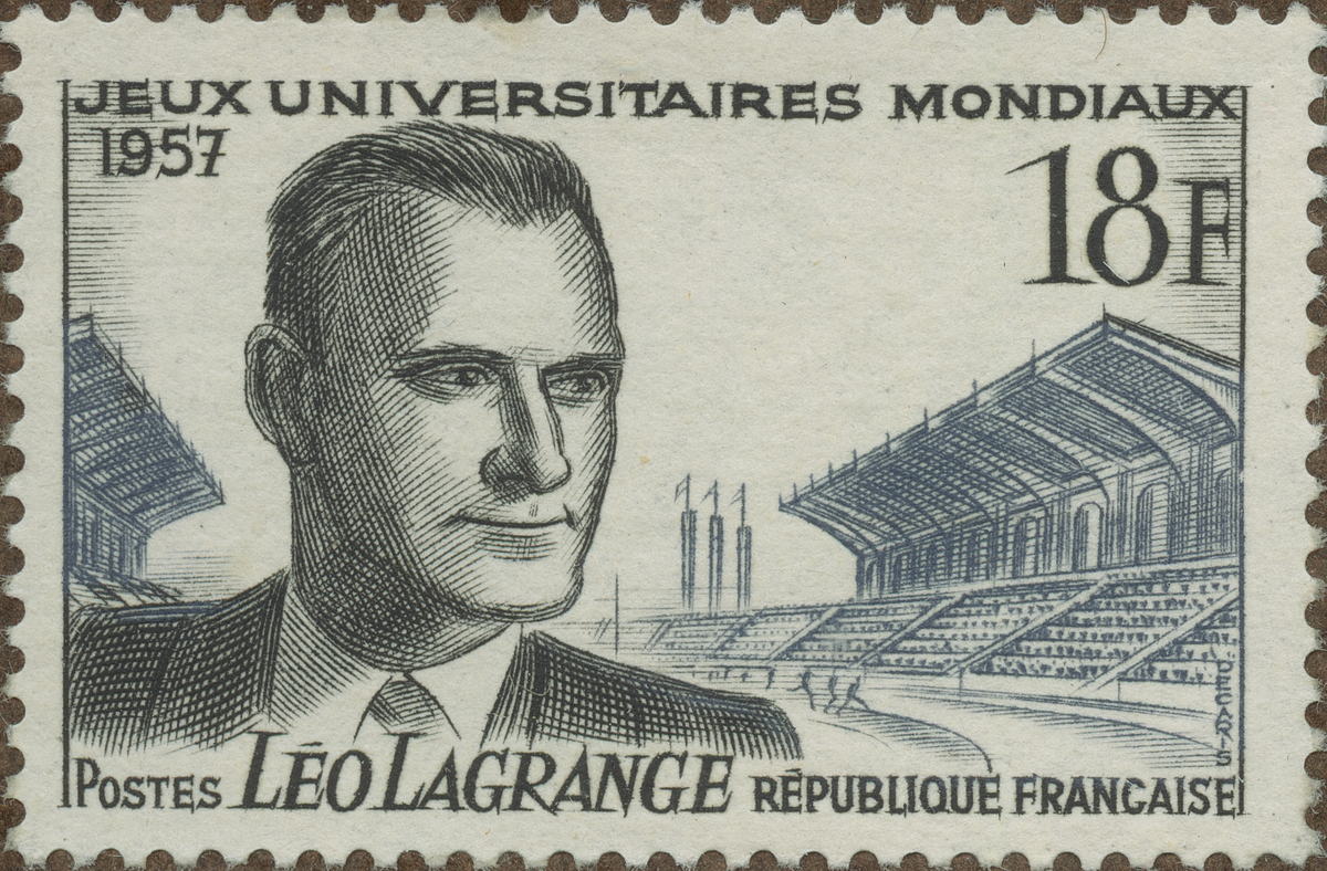 Frimärke från Frankrike, 1957. Motiv av Leo Lagrange. Stadion, läktare. Världstävling 1957.