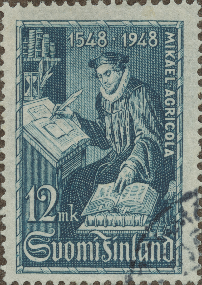 Frimärke från Finland, 1948. Motiv av "Bibeln översättes år 1548 till finska av Biskop Mikael Agricola". 400-årsminne. 1548-1948.