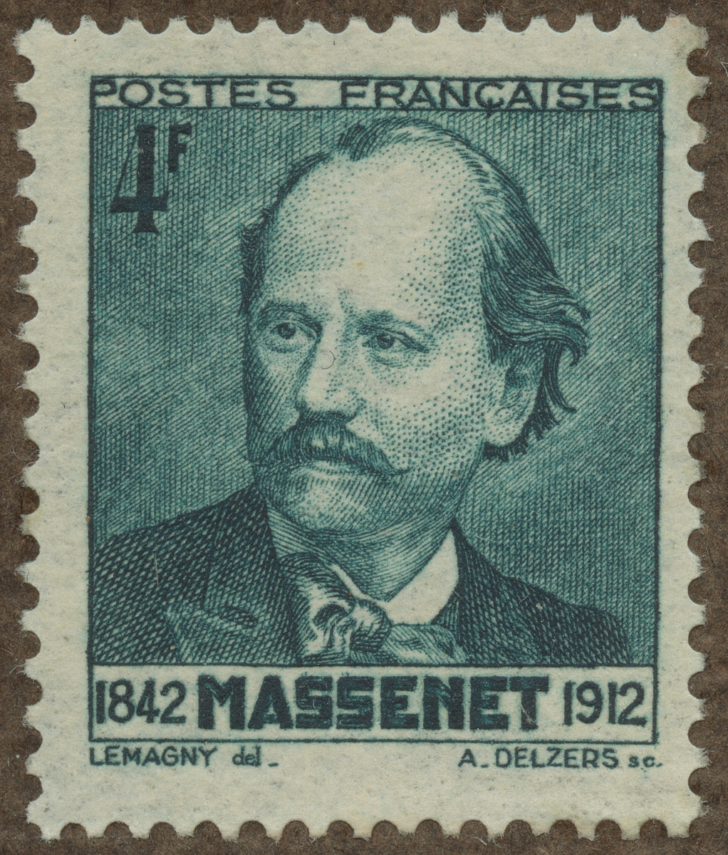 Frimärke från Frankrike, 1942. Motiv av Jules Massenet: 1842-1912. Fransk kompositör: "Manon" 100-årsminne av hans födelse: 1842-1942.