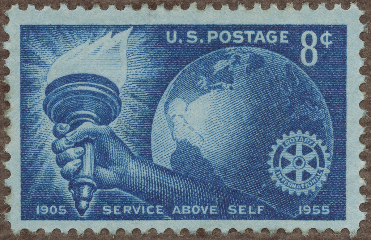 Frimärke från U.S.A., 1955. Motiv av Jordglob Hand med fackla "Rotary" 50 år 1905-1955 "Service above self" Tjänandets idé
