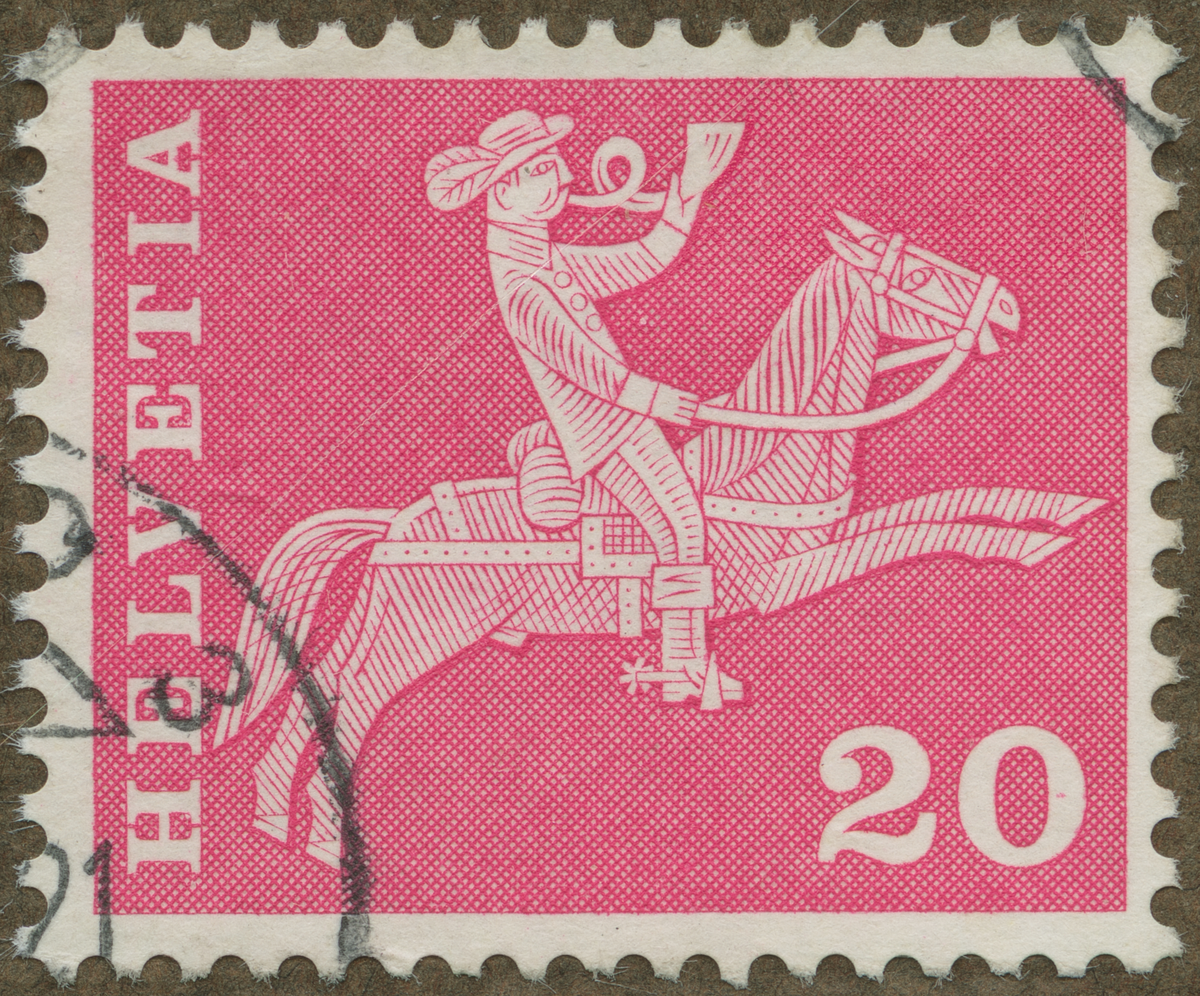Frimärke från Schweiz, 1960. Motiv av Postryttare från 1800-talet med posthorn