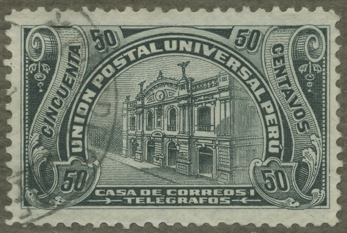 Frimärke från Peru, 1907. Motiv av Huvudpostkontoret i Lima