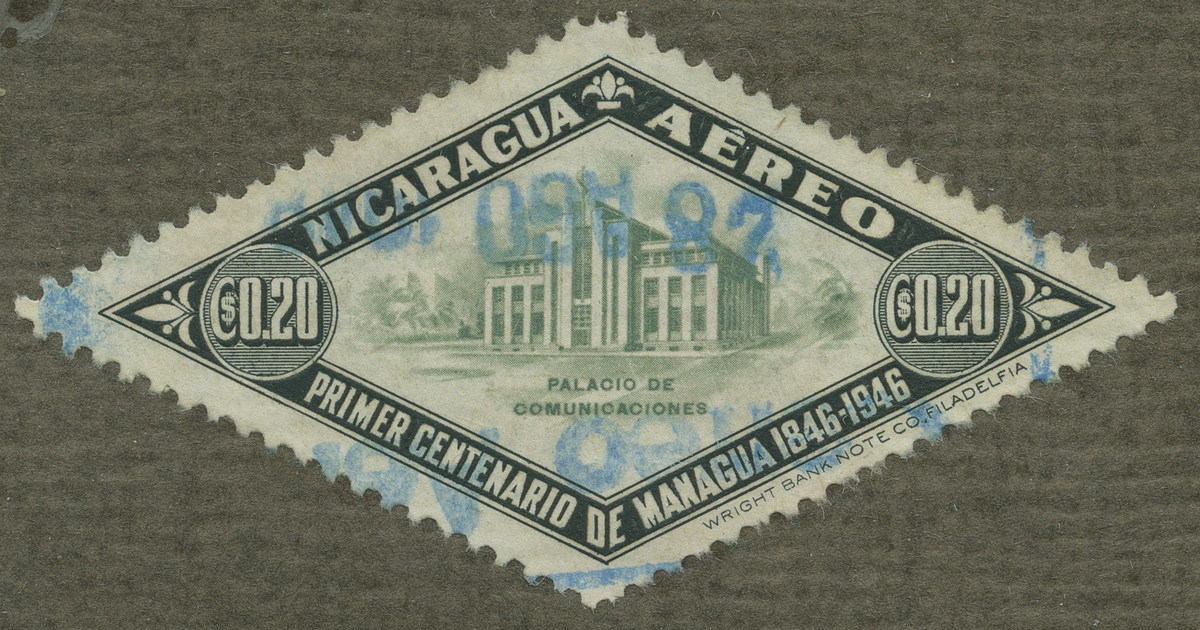 Frimärke från Nicaragua, 1946. Motiv av Huvudpostkontoret i huvudstaden Managua