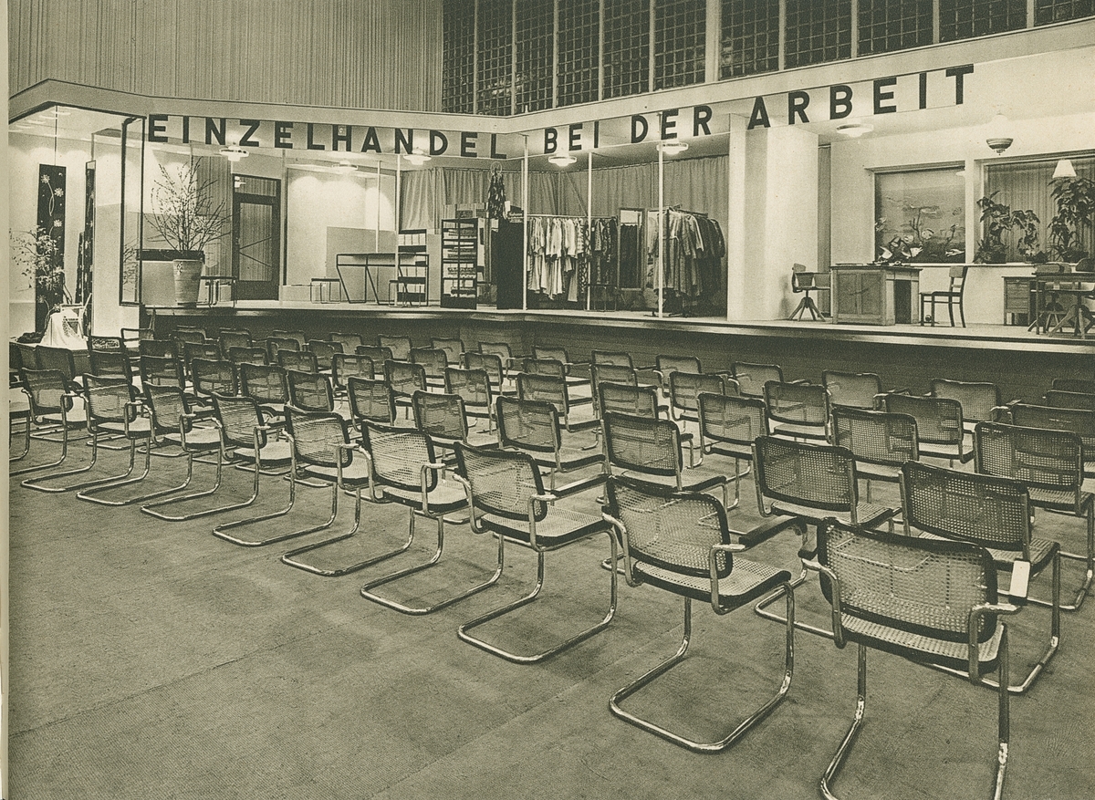 "Textileinzelhandel", "Musteranlage einer Austellung, Schaufenster: Kugelzonenspiegel JK 320, Verkaufsraum: Stufenspiegelleuchten JSt 15, Büro: Glockenspiegelleuchten für indirektes Licht HG 3".