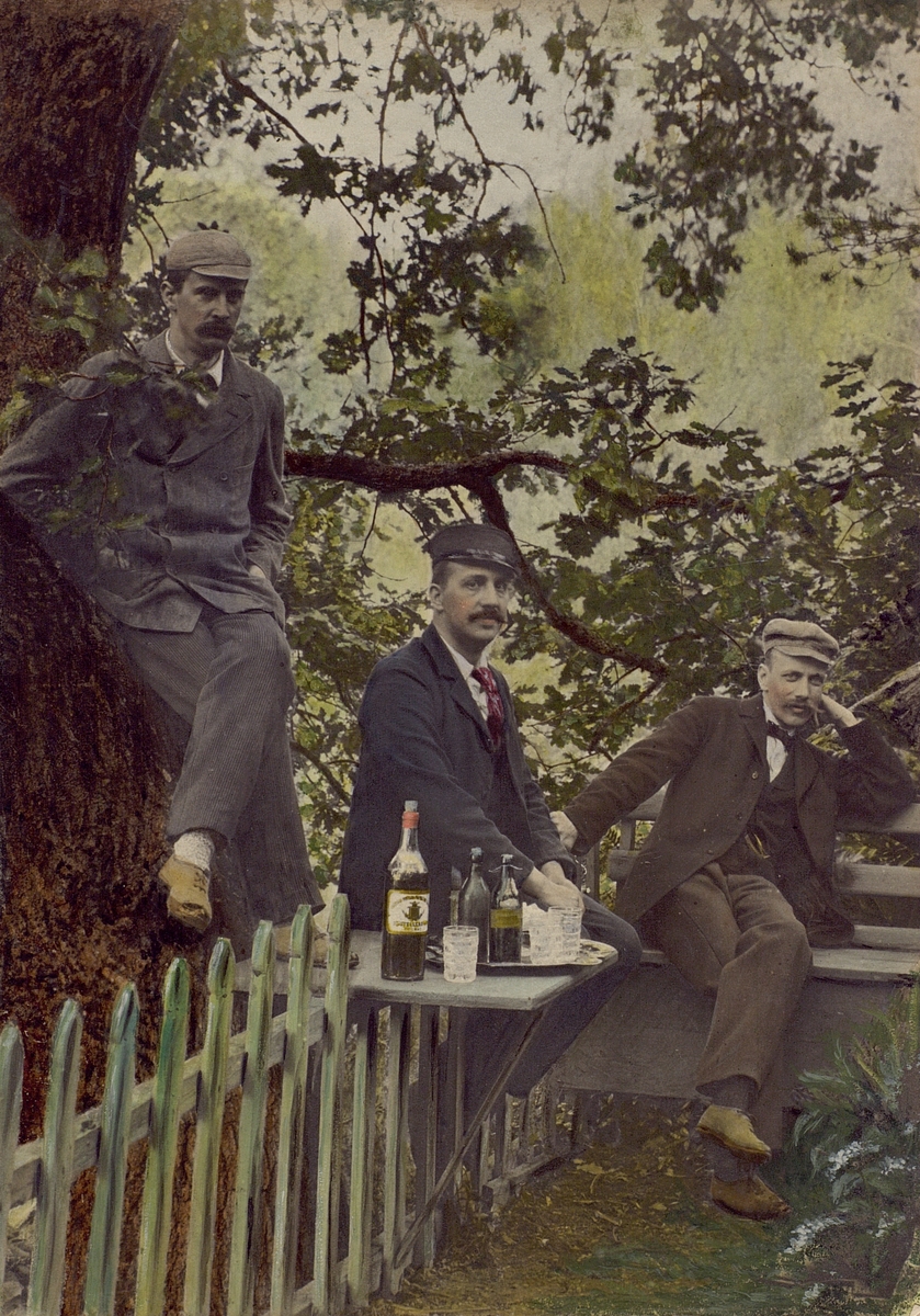 Handkolorerat fotografi från år 1909. Telegrafkommissarie W.Wulf, Arvika, Telegrafkommissarie K. Uhlfeld Kristinehamn, Trafikinspektör N. distr. S. Linde, Sollefteå.