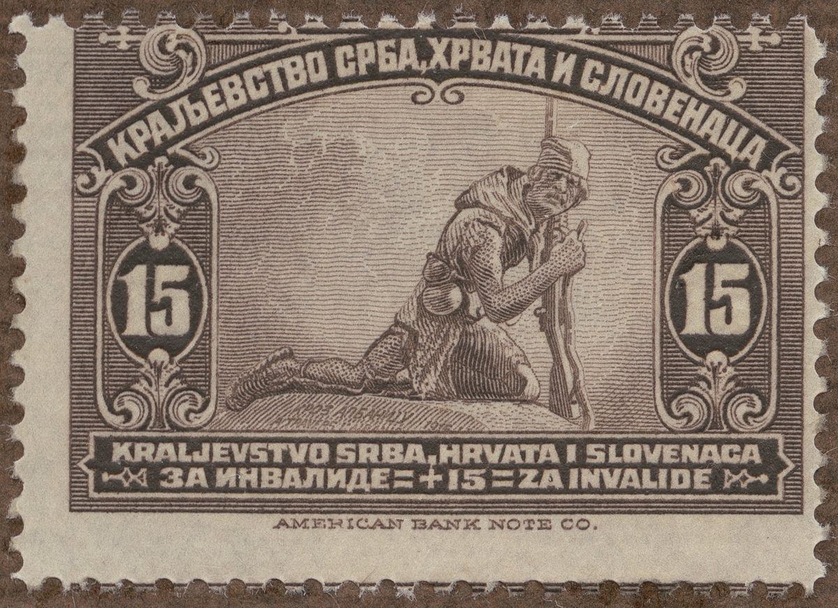 Frimärke från Jugoslavien, 1921. Motiv av Sårad jugoslavisk soldat med sitt gevär Minne av reträtten 1915