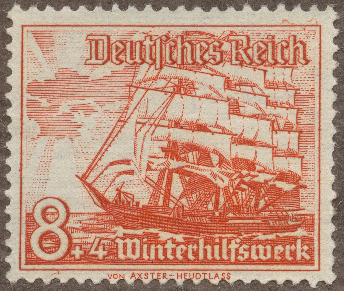 Frimärke från Tyskland, 1937. Motiv av Tysk fyrmastare för fulla segel -Till förmån för vinterhjälpen-