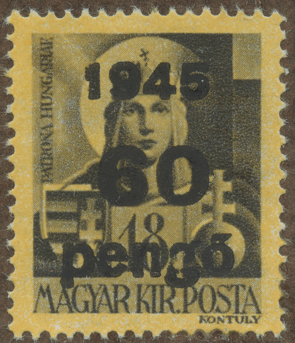 Frimärke från Ungern, 1943 med överstämpel 1945. Motiv av Madonnan: -Patrona Hungariae- Ungerns skyddshelgon. (med 1945 stämpel)