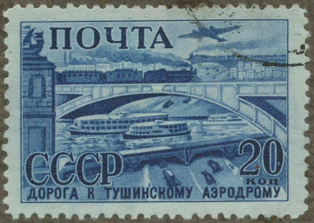 Frimärke från Ryssland, 1941. Motiv av järnvägsbro över Volgakanalen "Industri- eller den s.k. "Stachanovserien"