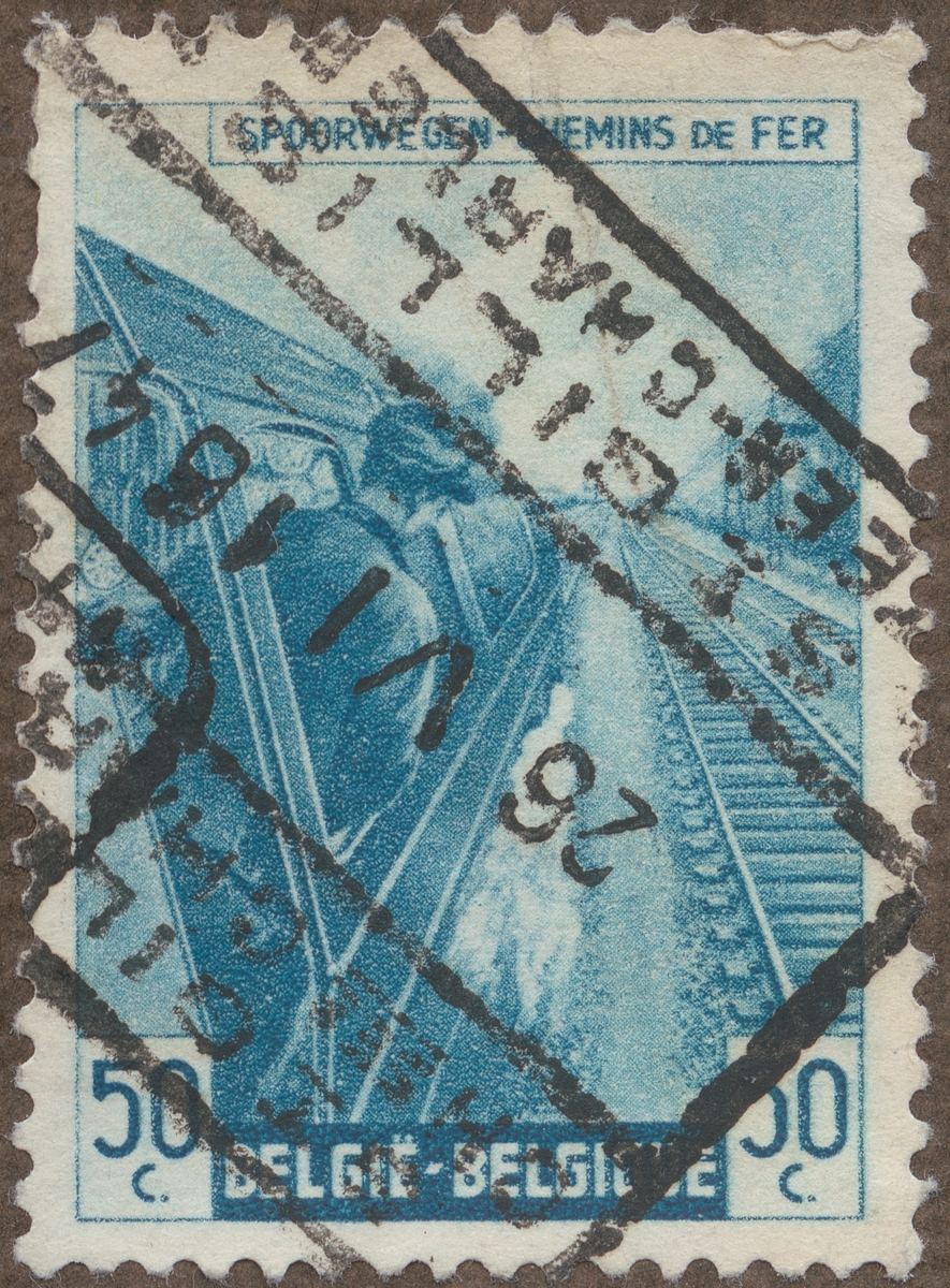 Frimärke ur Gösta Bodmans filatelistiska motivsamling, påbörjad 1950. Frimärke från Belgien, 1942. Motiv av Belgisk lokförare