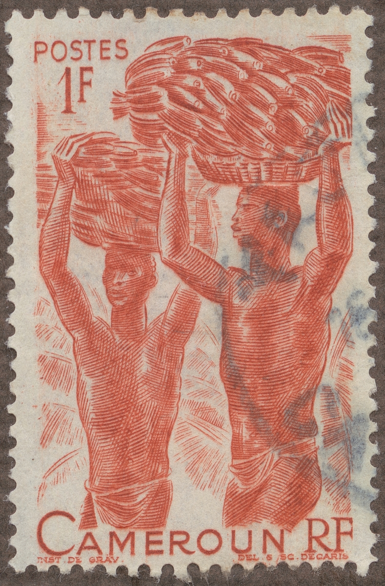 Frimärke från Camerun, 1946. Motiv av banantransport.