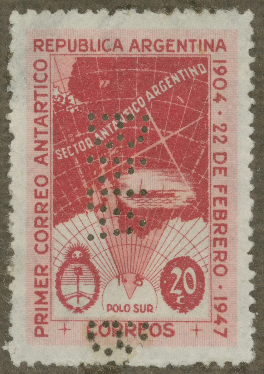 Frimärke från Argentina, 1947. Motiv av karta över Argentinas antarktiska sektionspretentionner den 22 februari 1904.