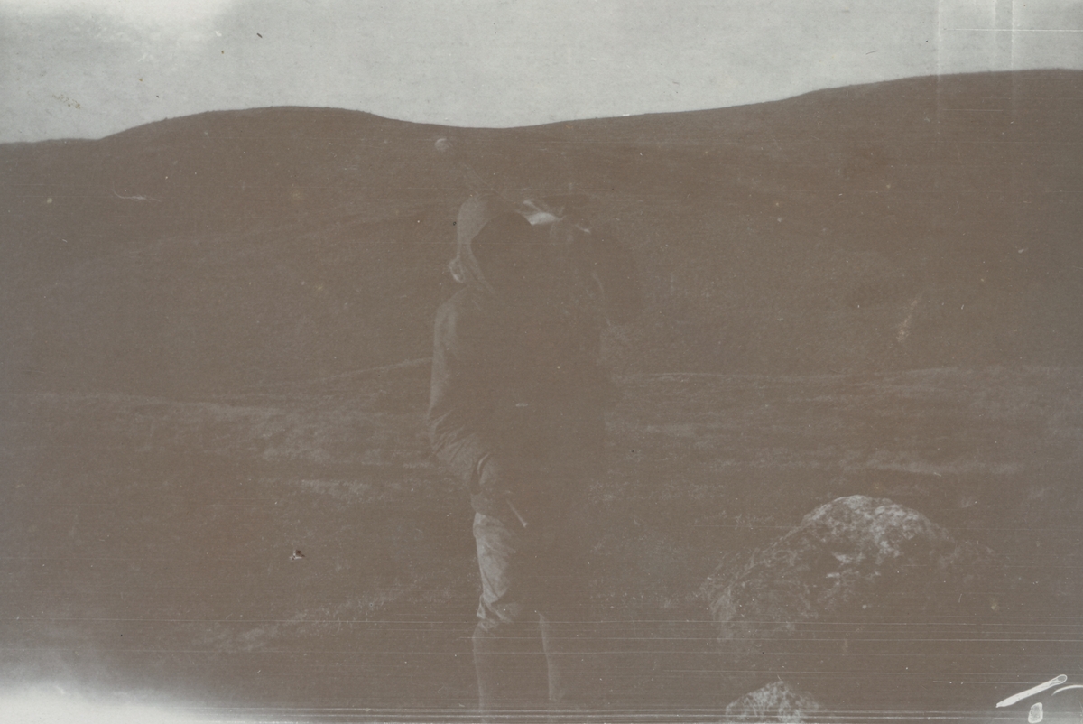 Fotografi från expedition till Grönland. Motiv av ensam man som står i ett bergslandskap och bär något, till synes tungt, över ena axeln.