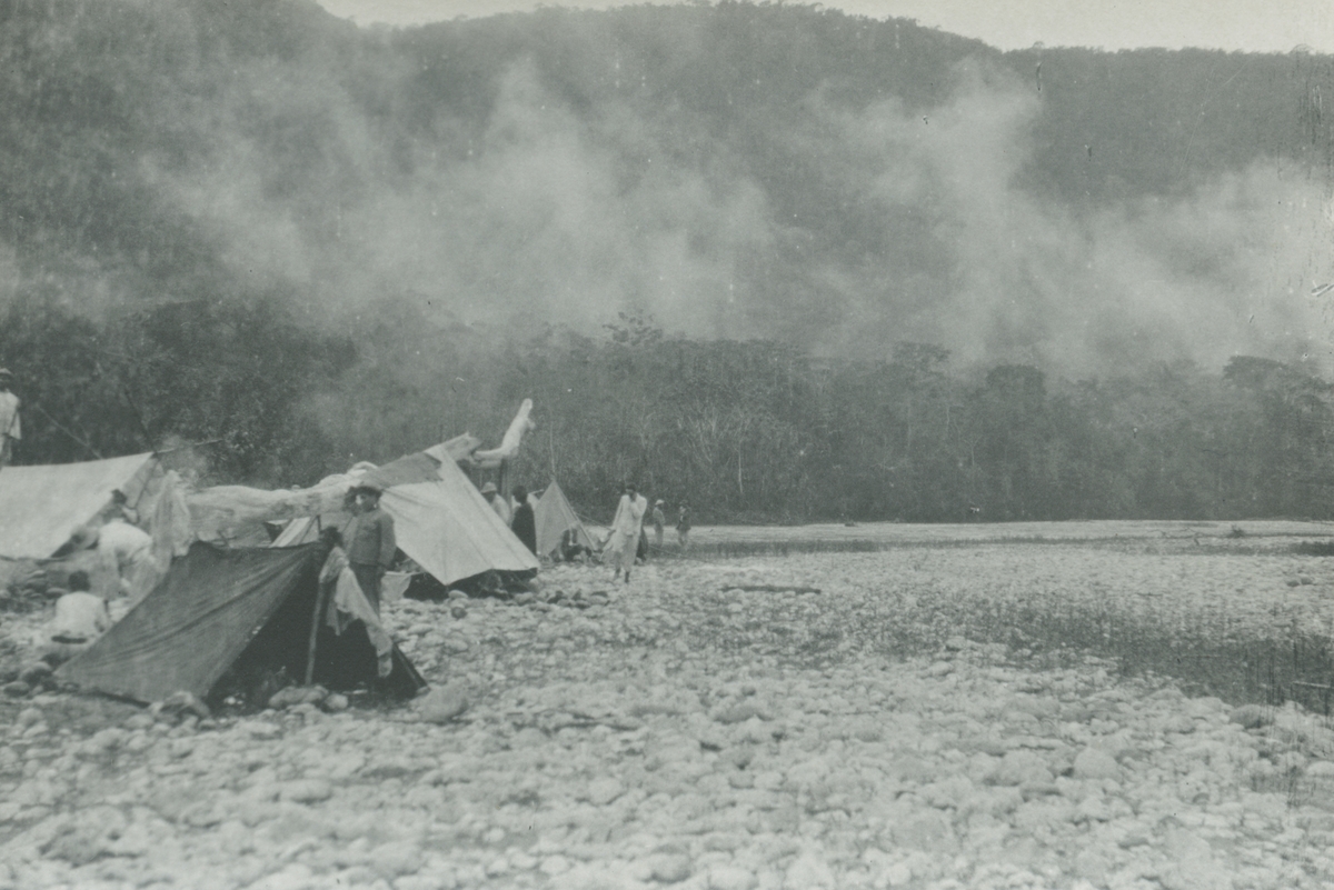 Fotografi från expedition till Peru 1920. Motiv av tält som är uppställda på stenig strand bredvid tätbevuxen och dimhöljd djungel.