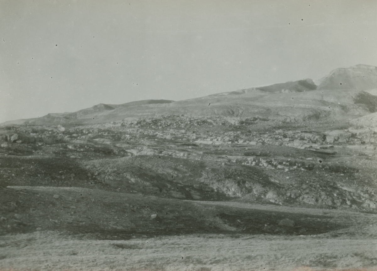 Fotografi från expedition till Östgrönland 1929. Dansk-svensk expedition under ledning av Lauge Koch. Svenska deltagare: Oscar Kulling och Helge Backlund. Vy över ett stenigt och kargt bergslandskap.