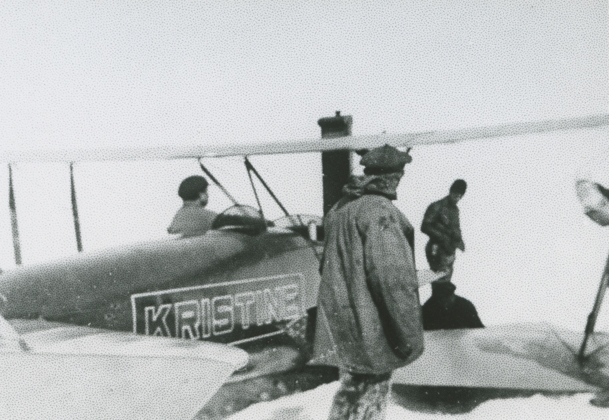 Fotografi från svenska undsättningsexpeditionen 1928. Motiv av tre män och flygplan i snön.