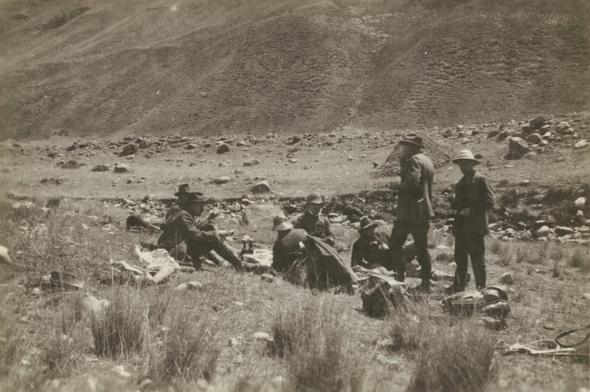 Fotografi från kuvert märkt med "Ernst Nordenskjöld". Motiv av en grupp expeditionsdeltagare som vilar i ett bergslandskap.
