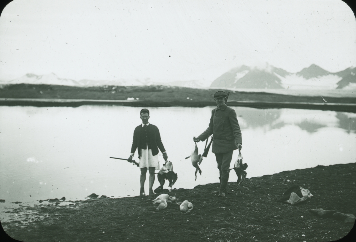 Fotografi från expedition till Spetsbergen. Motiv av två män som skjutit ett antal fåglar.