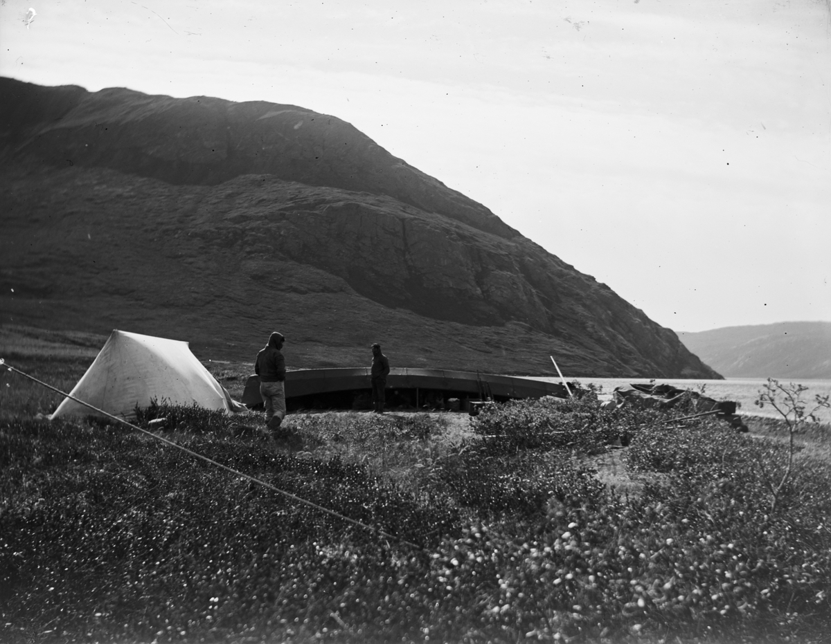 Fotografi från Grönland. Motiv av två män med båt och tält på strand nedanför berg.