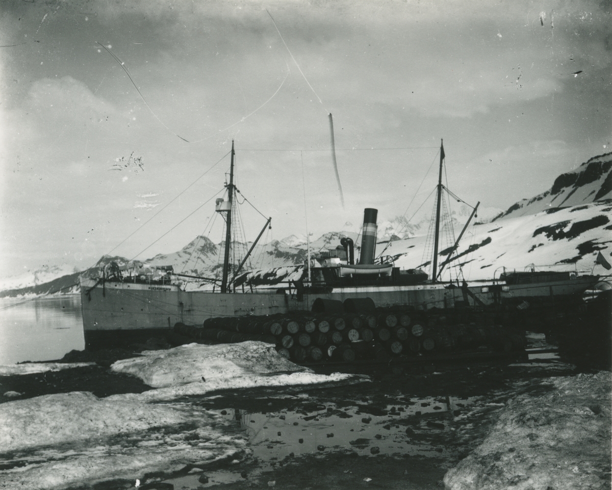 Bild från expedition i Antarktisområdet. Motiv av båt i hamn med snötäckta berg i bakgrunden.
