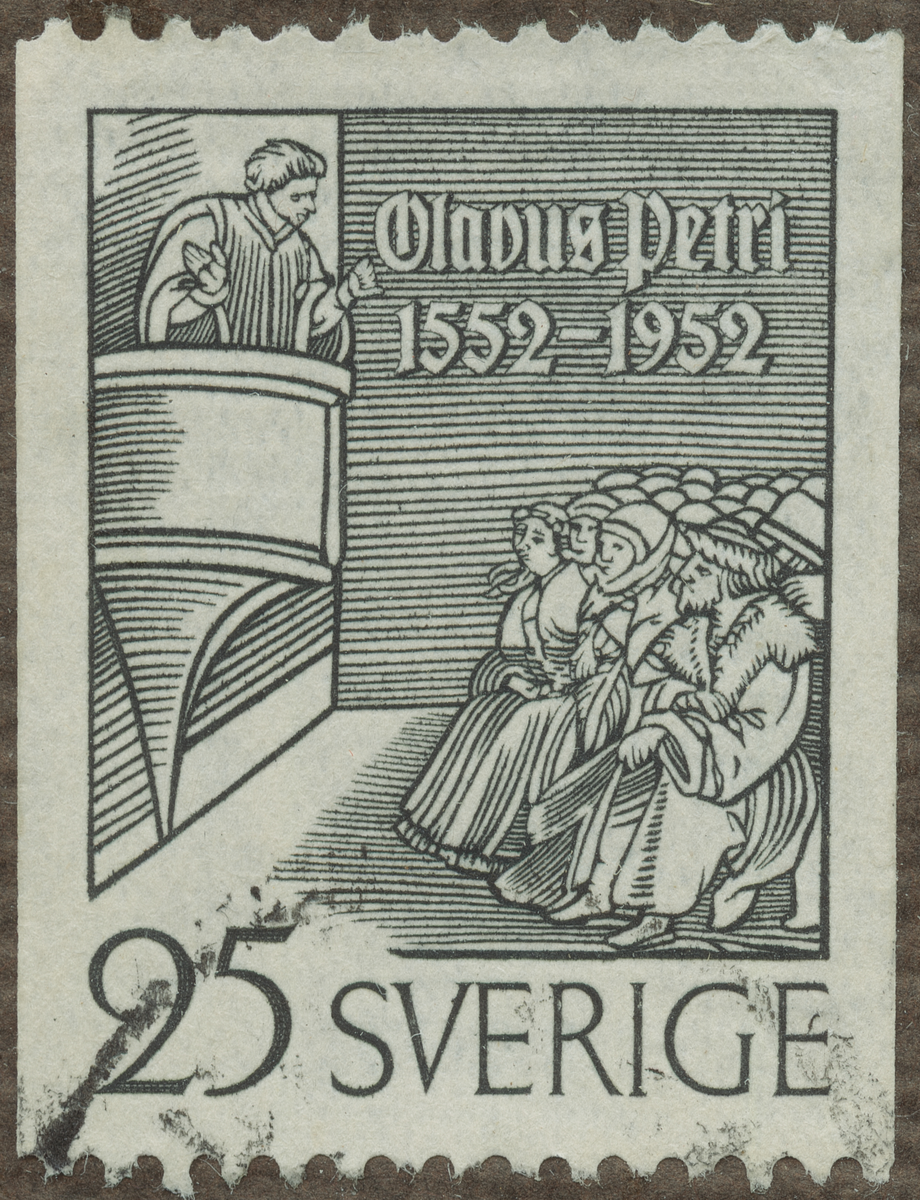 Frimärke från Sverige, 1952. Motiv av Olaus Petri (Phase): "Mäster Olof": 1493-1552. Svenska kyrkans reformator Kyrklig författare Stockholm Stads sekreterare. -400-årsminnet av hans död: 1552-1952.