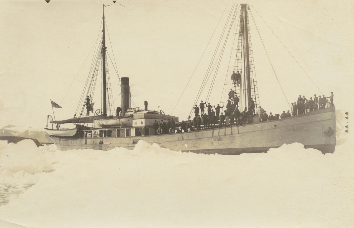 Fotografi från expedition till Spetsbergen 1920. Motiv av fartyg och snö. På fartyget syns en stor grupp besättningsmän.