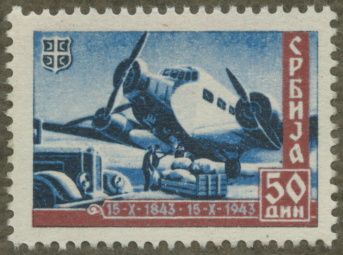 Frimärke från Serbien, 1943. Motiv av Postflygmaskin i Serbien Serbiska Posten 100 år 15.10.1843-15.10. 1943