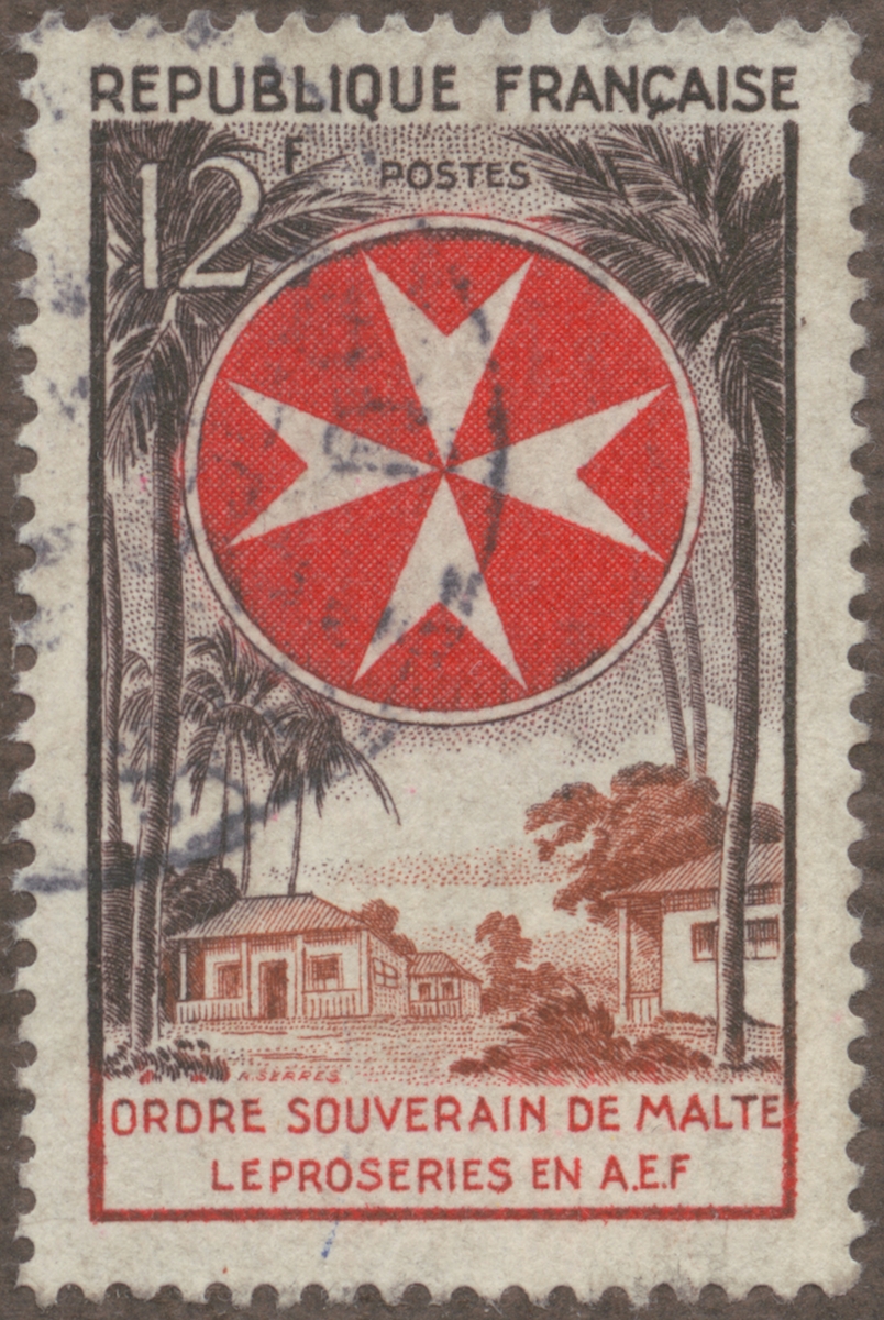Frimärke från Frankrike, 1956. Motiv av Malteserkorset (nedan) Malteser Ordens Spetälska Sjukhus i Franska Ekvatoriala Afrika.