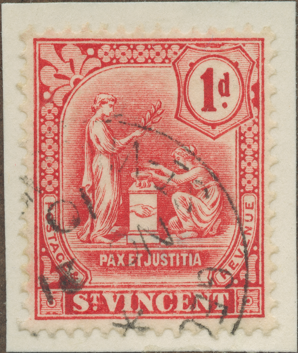 Frimärke från Saint-Vincent, 1909. Motiv av Symboler Pax et Justitia (Fred och Rättvisa)