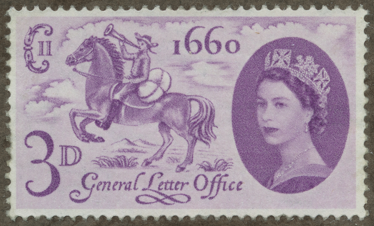 Frimärke från England, 1960. Motiv av Postryttare från 1660 Drottning Elisabeth II. 300-årsminne av det engelska postväsendets grundande i 1660: s.k. "General Letter Office" = (General Post Office)