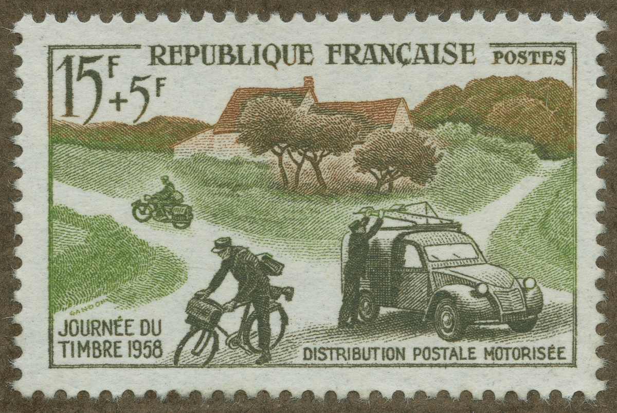 Frimärke från Frankrike, 1958. Motiv av Postens motorisering Frimärkets dag 1958