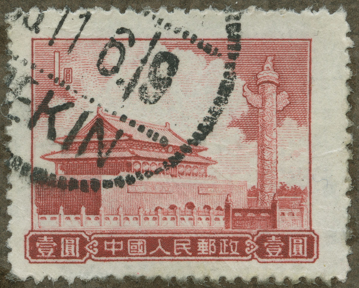 Frimärke från Kina, 1945. Motiv av Himmelska Fridens Port i Peking -7-årsminne av postens införande i Nord-Kina: 1938-1945-
