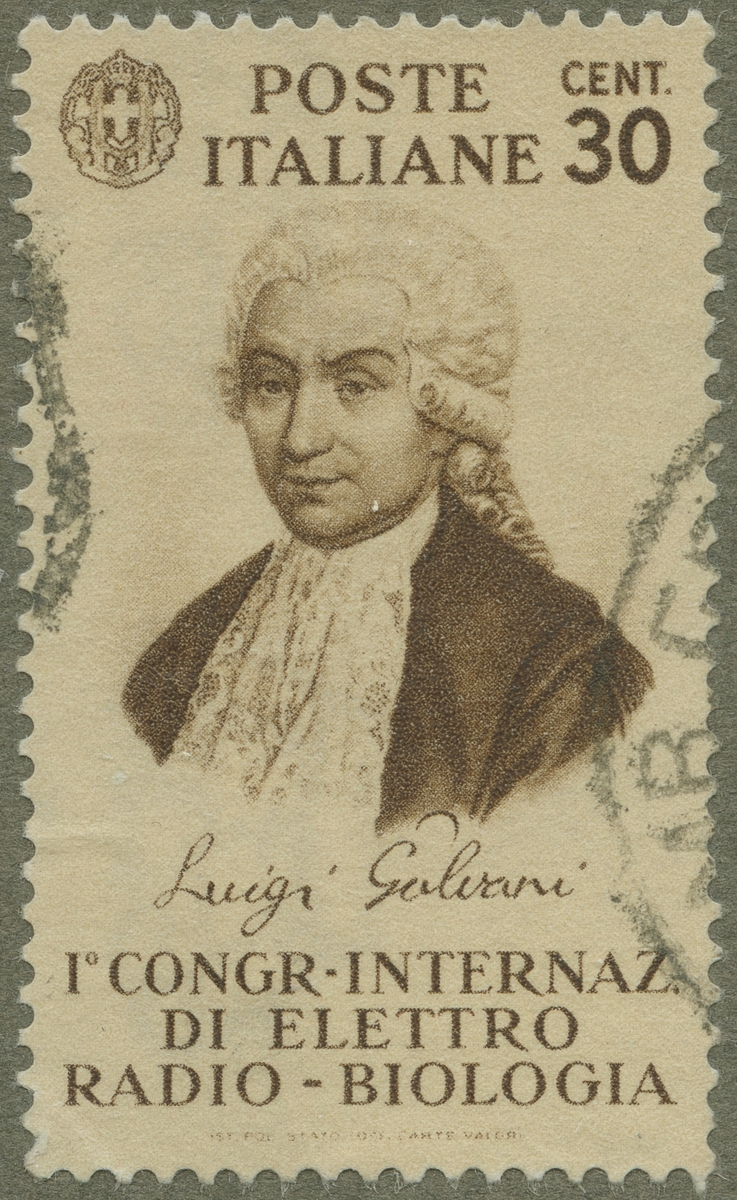 Frimärke från Italien, 1934. Motiv av Luigi Galvani 1737-1798. Fysiker, läkare i Italien. Upptäckte muskelelektriciteten 1791. "Galvanism" "Galvaniska strömmar". 1:a internationella kongressen för elektro- och radio-biologi.