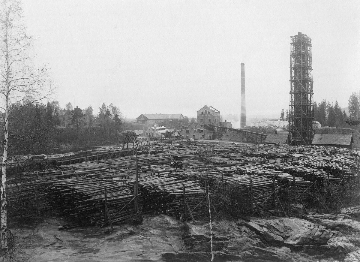 Koppoms pappersbruk sett från sydväst. Till vänster ses administrationsbyggnaden. Huset bakom, byggt i vinkel och försett med fem skorstenar, är jordbrukets ekonomihus.