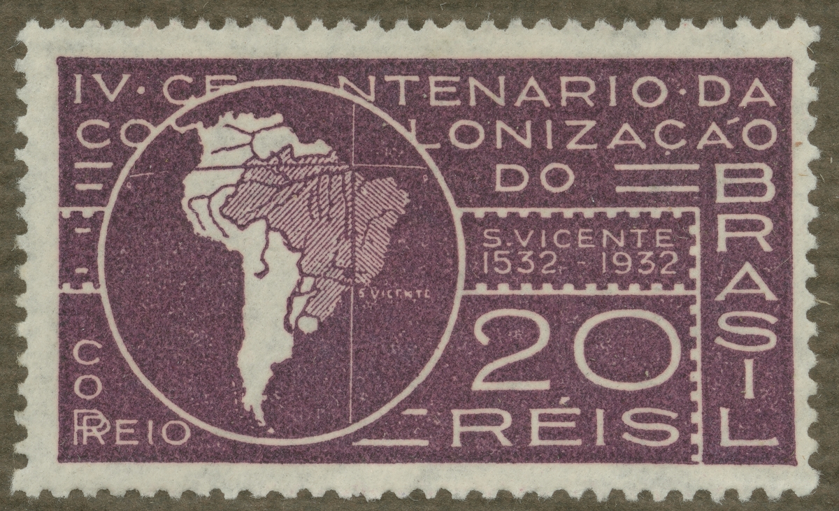 Frimärke från Brasilien, 1932. Motiv av karta över Brasilien. Merdian över Tordesillas. "400-årsminne av Santo Vicentes grundläggning 1532-1932".