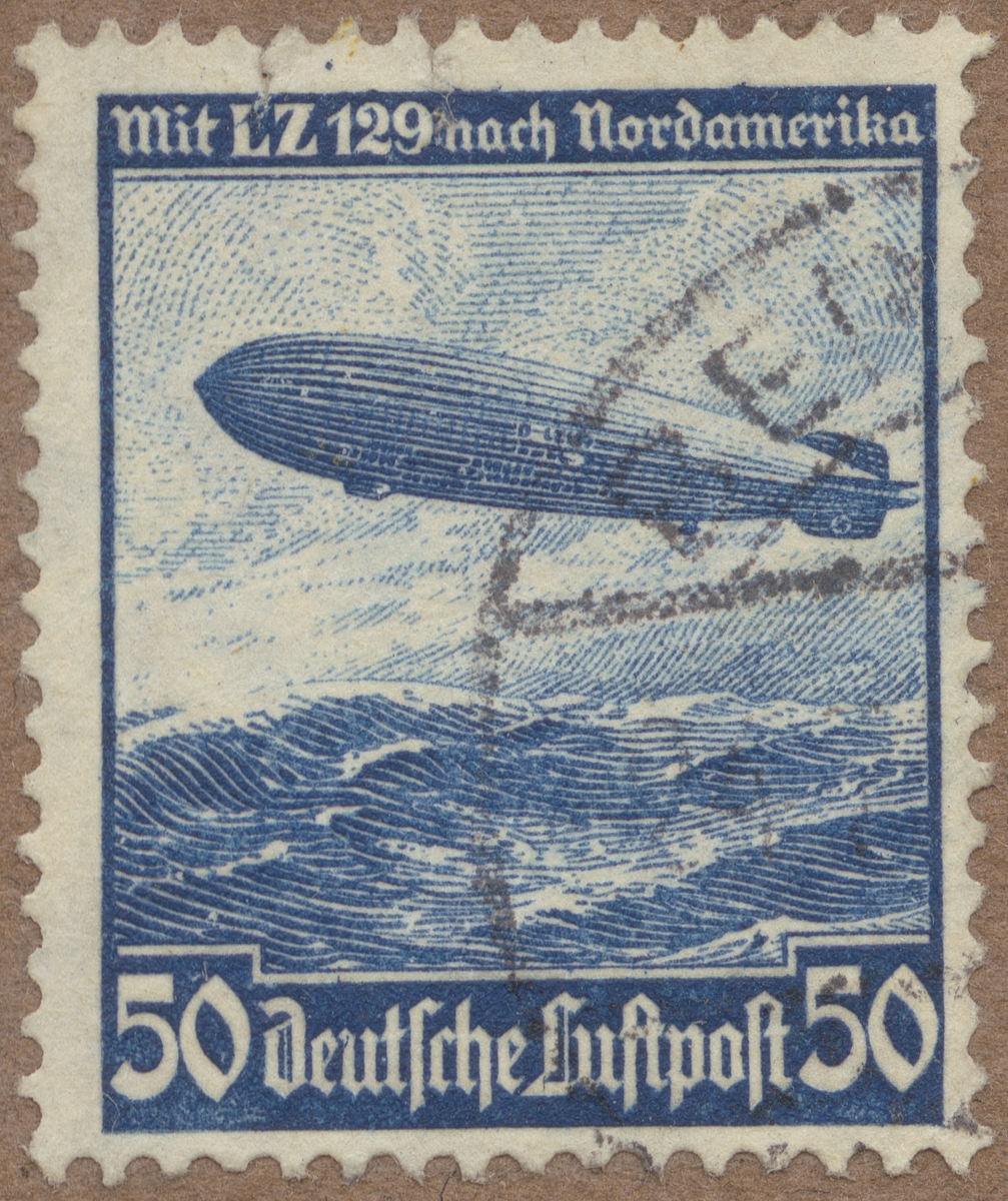 Frimärke från Tyskland, 1936. Motiv av Det tyska Zeppelinluftskeppet L.Z. 129 över havet på väg till Nord Amerika.