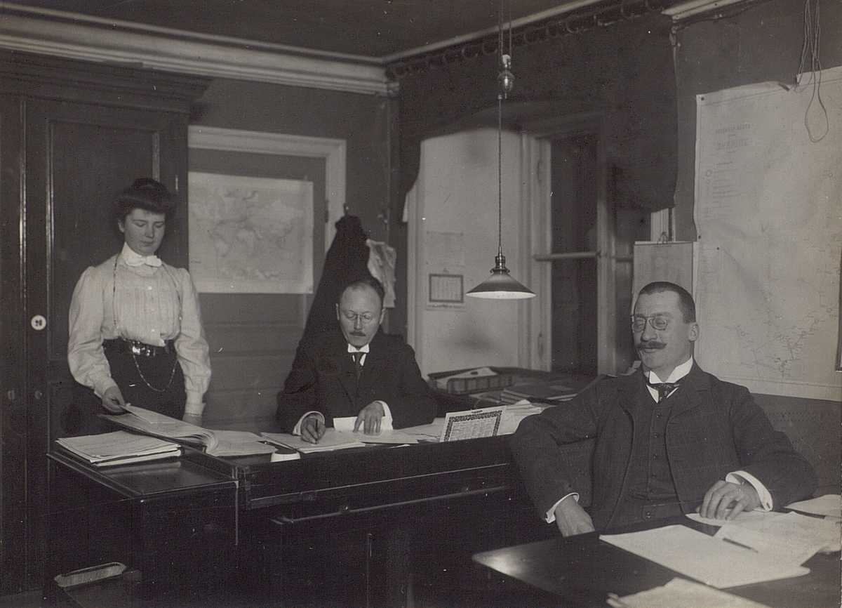 Telegrafstyrelsen år 1907. Revisor Blom, Elsa Cronland, byråchef Nils L.H. Johansson.