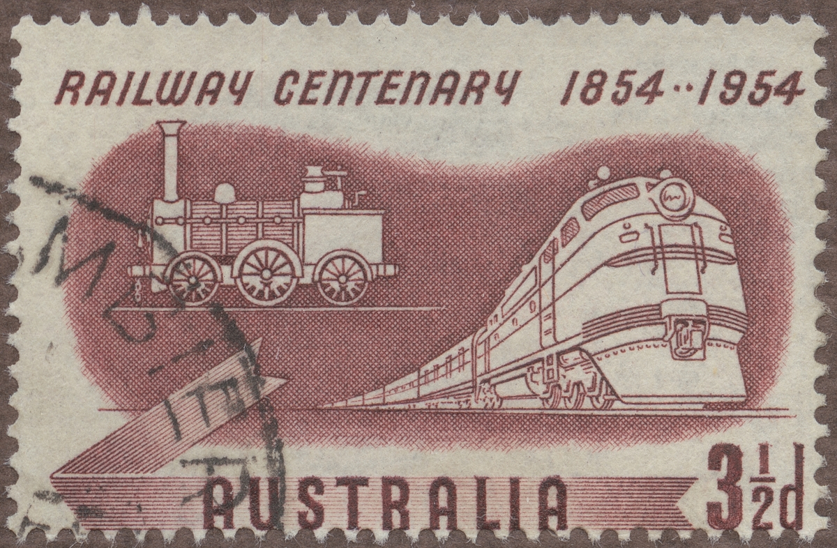 Frimärken ur Gösta Bodmans filatelistiska motivsamling, påbörjad 1950. Frimärke från Australien, 1954. Motiv av Australiska lokomotiv: Gammalt ånglok från 1854:- o.Nytt Diesellok av år 1954. "Australiens järnvägar 100 år: 1854-1954"