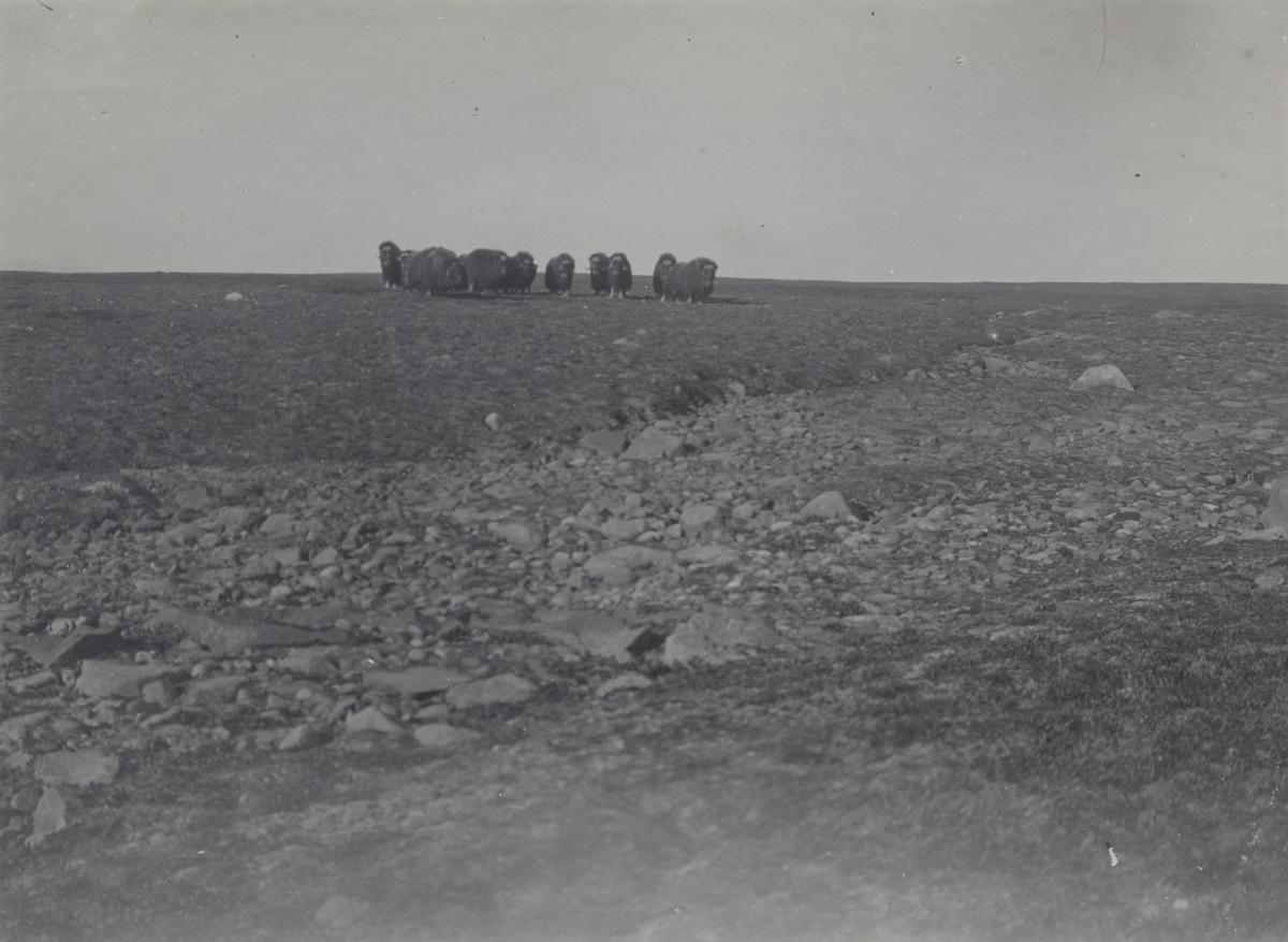 Fotografi från expedition till Grönland. Landskapsbild med myskoxar i bakgrunden.