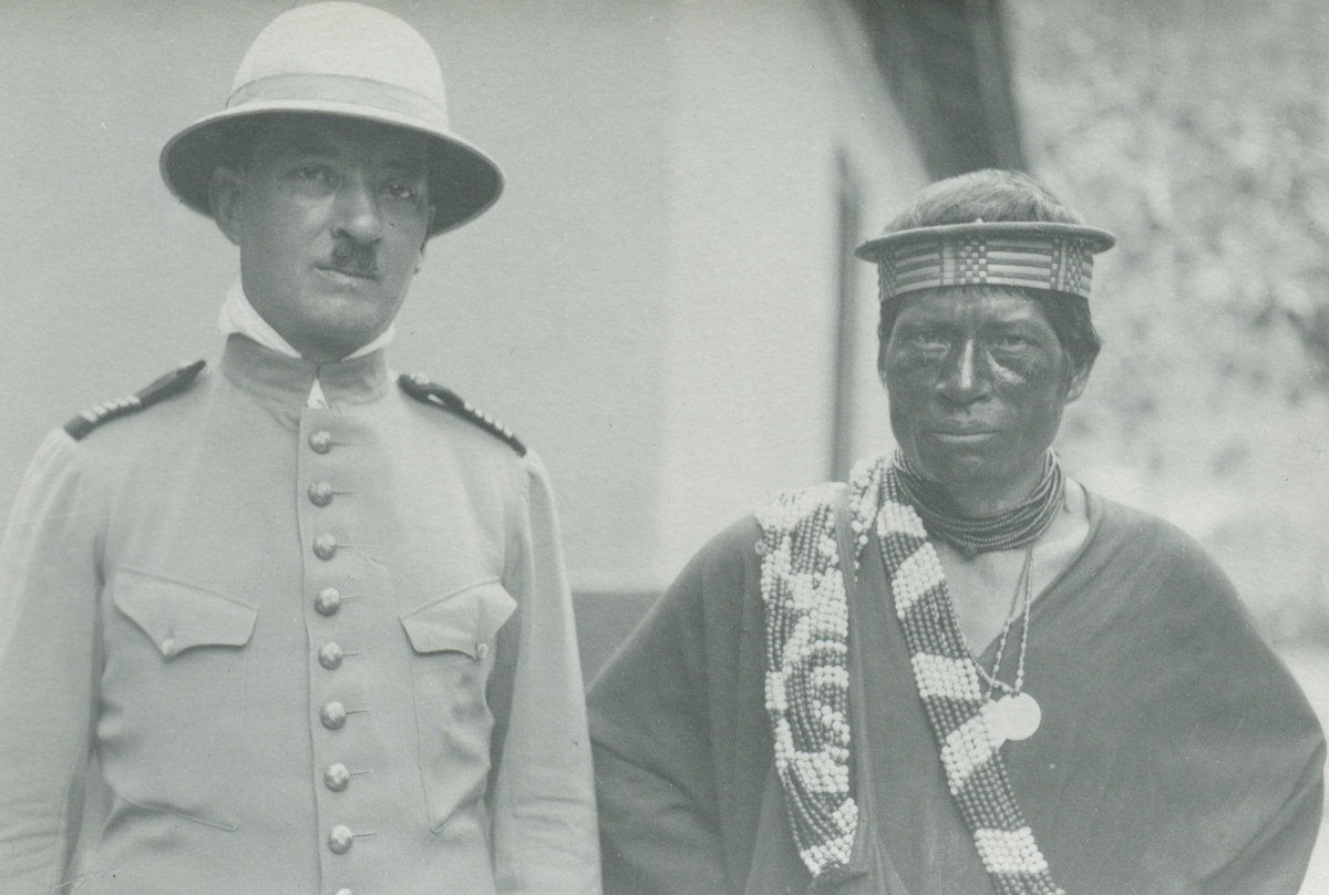 Fotografi från expedition till Peru 1920. Motiv av expeditionsdeltagare som står bredvid man framför ett hus. Mannen till vänster är möjligen expeditionens kartograf Nils Pallin.
