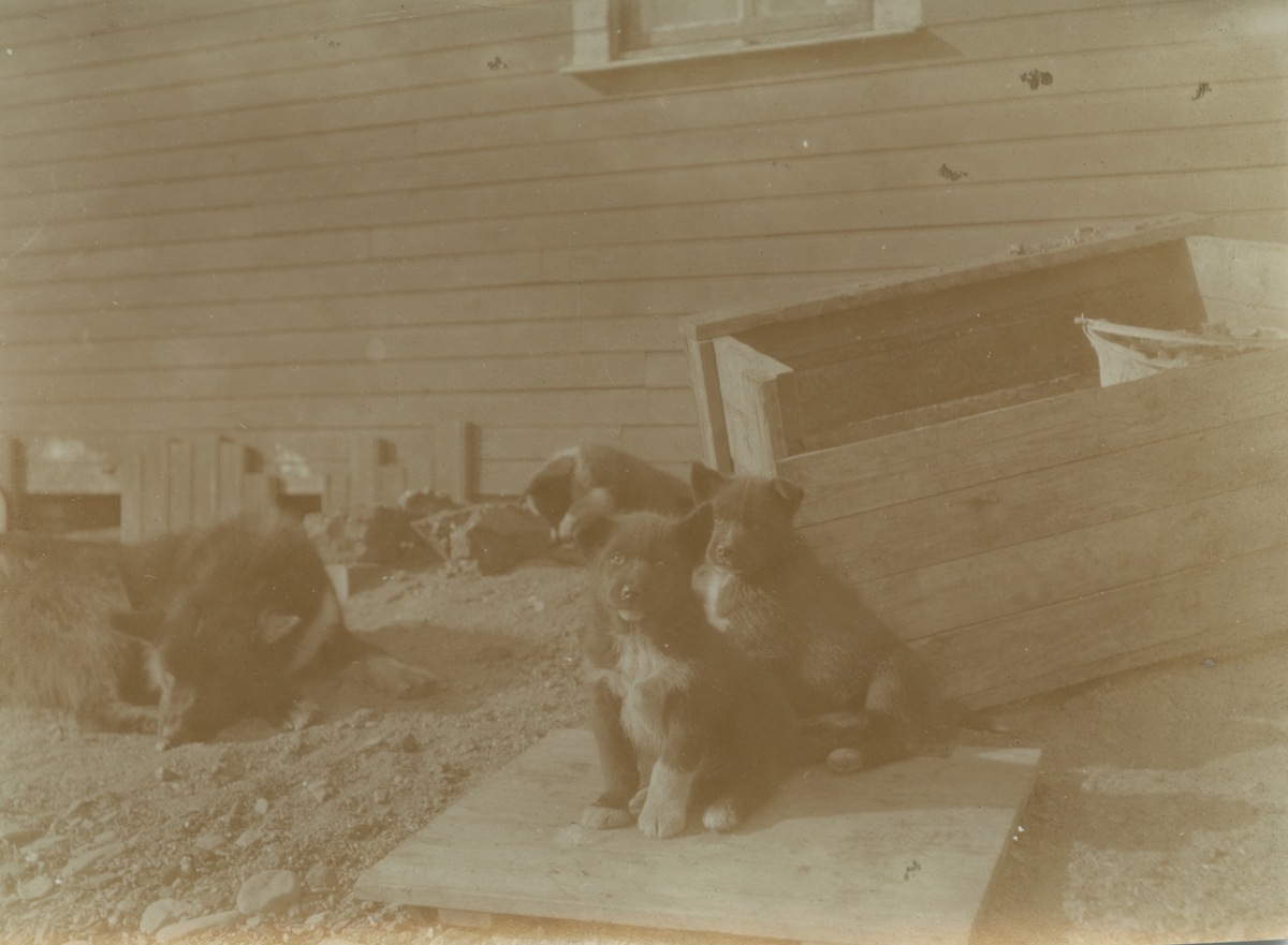 Fotografi från expedition till Sveagruvan. Motiv av hundvalpar utanför trähus.