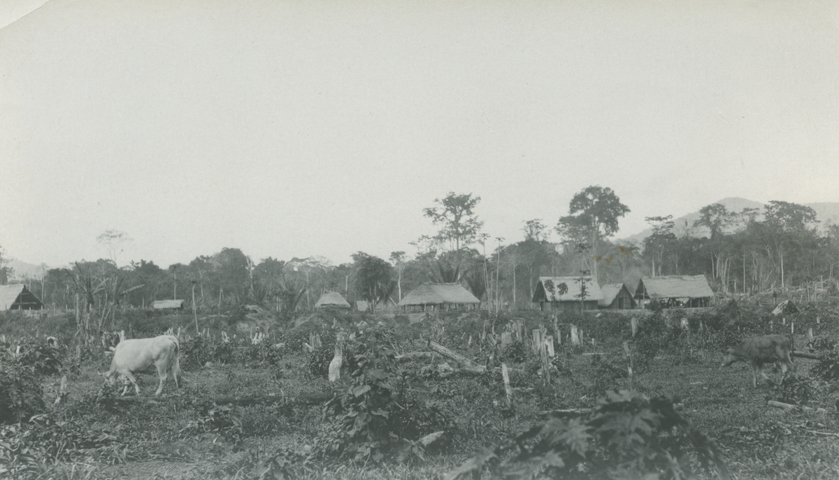 Fotografi från expedition till Peru 1920. Motiv av liten by i djungeln.