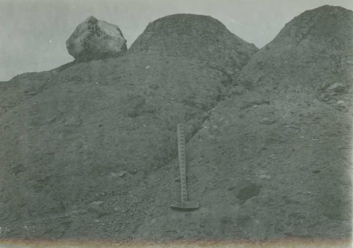 Fotografi från expedition till Östgrönland 1929. Dansk-svensk expedition under ledning av Lauge Koch. Svenska deltagare: Oscar Kulling och Helge Backlund. Närbild av bergvägg med slägga/hammare.