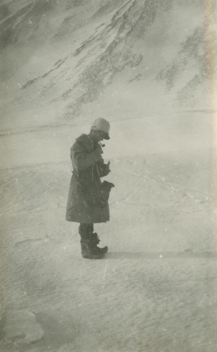 Fotografi från expedition till Spetsbergen. Motiv av man som står i isigt bergslandskap.