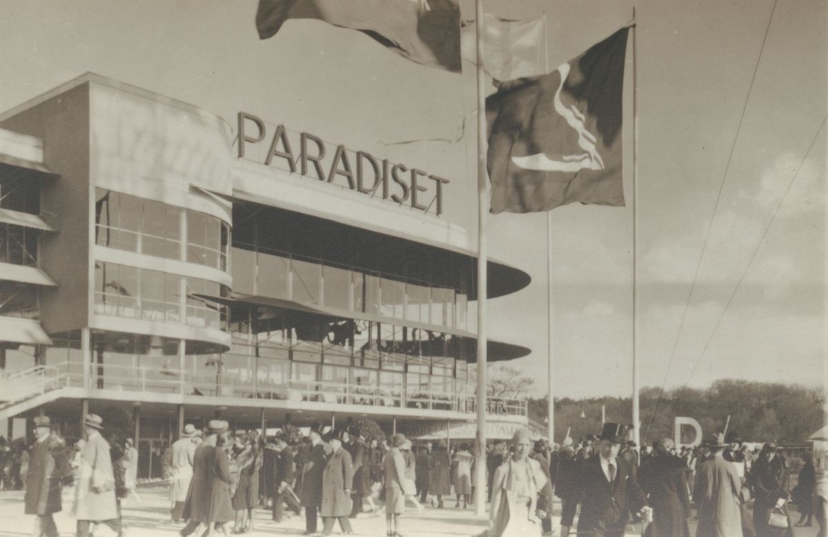 Fotografi från Stockholmsutställningen 1930. Motiv av människor utanför byggnad med skylten "Paradiset".