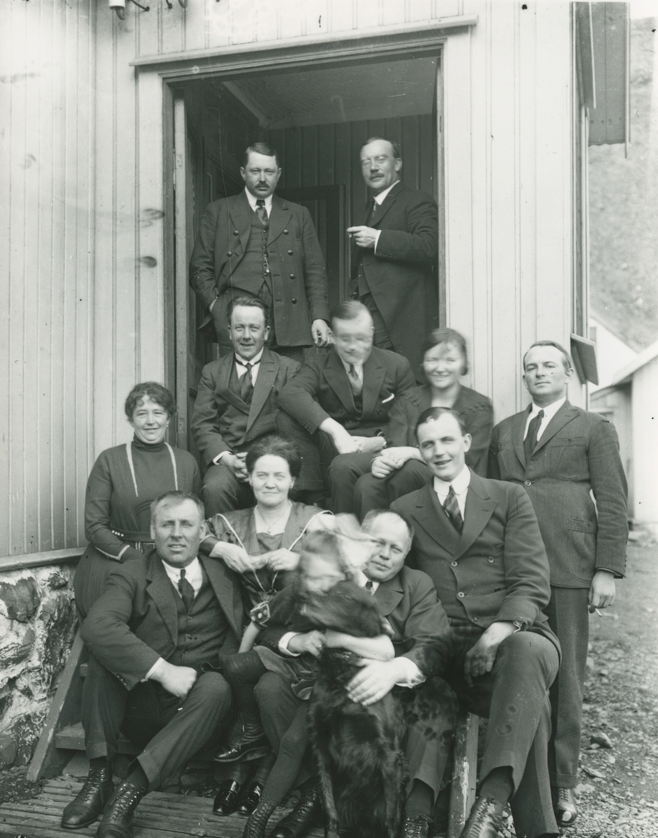 Bild från expedition i Antarktisområdet. Motiv av stor grupp människor utanför ingången till hus på King Edward's Point. Makarna Binnie syns på mittenraden längst ut och tredje från vänster.