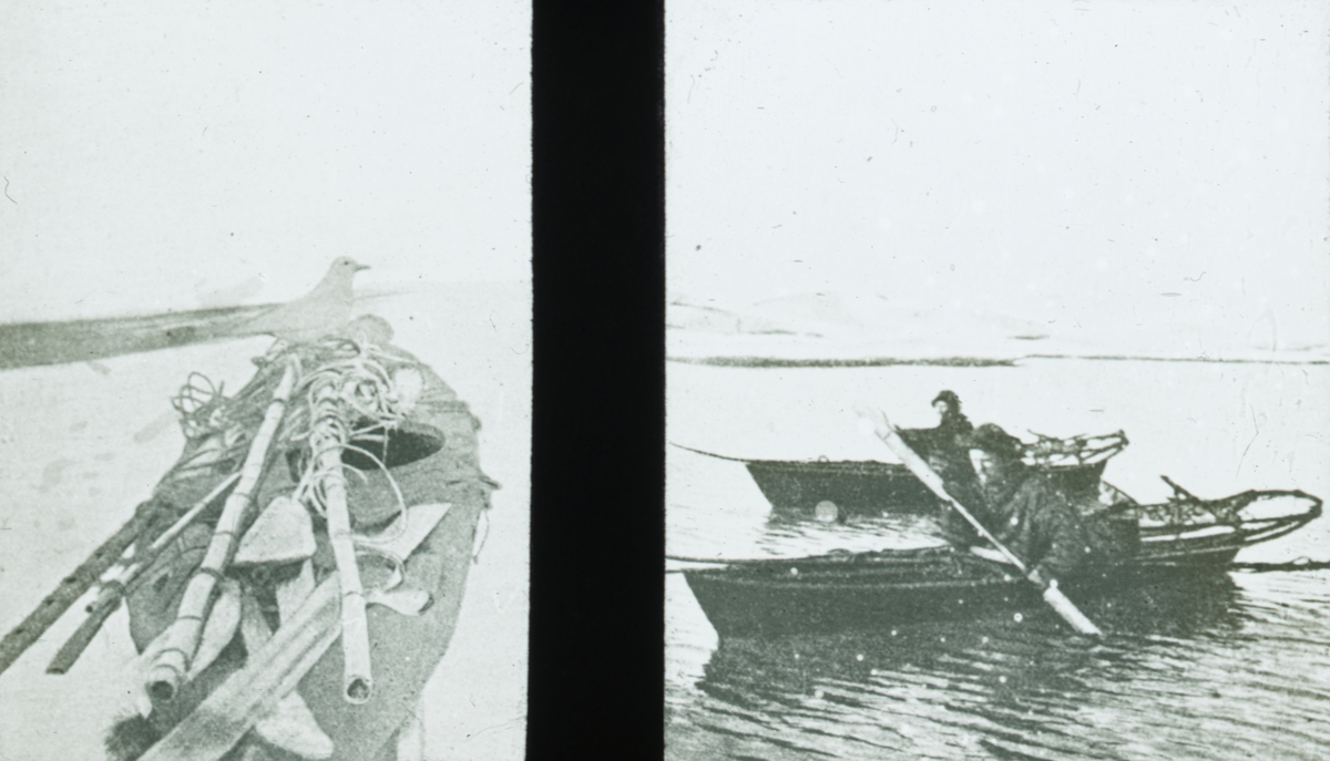 Fotografi från Grönland. Stereofotografi med motiv av män i kajak och fågel.