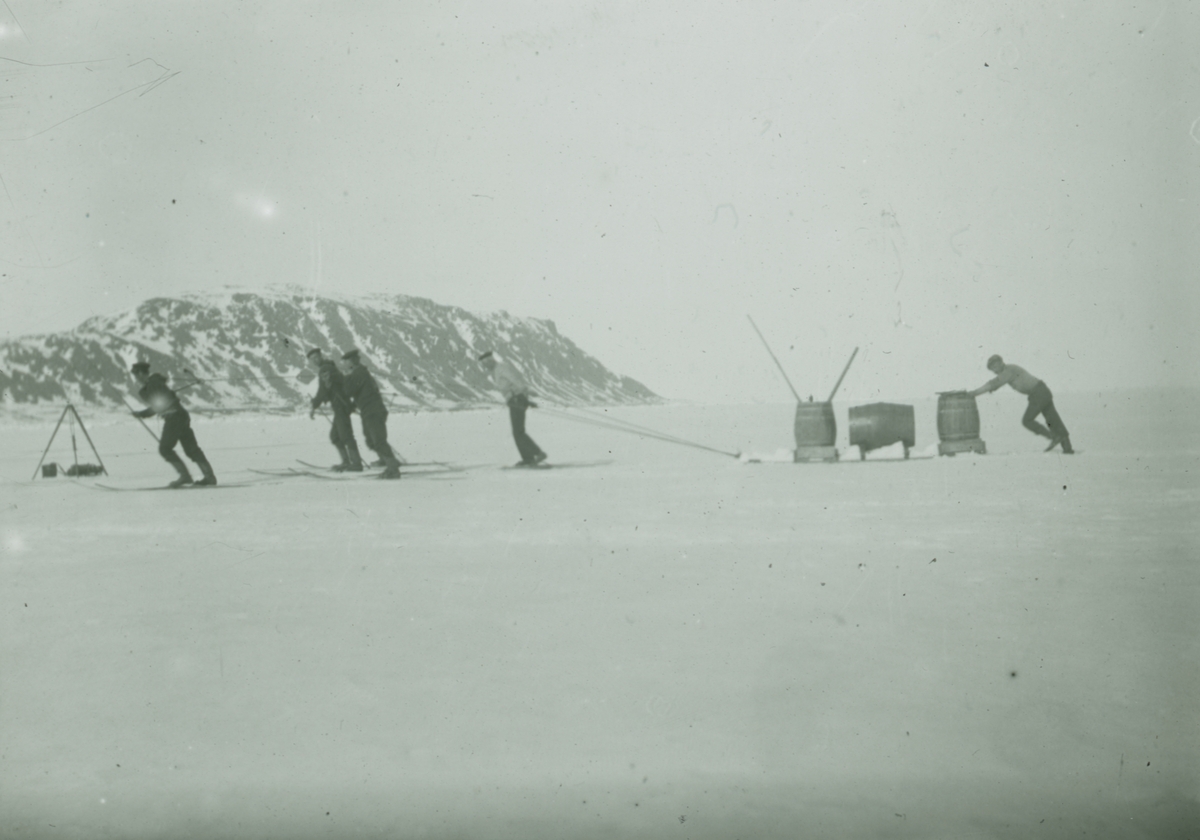 Fotografi från expedition till Spetsbergen. Motiv av en grupp män som släpar packning i snölandskap.