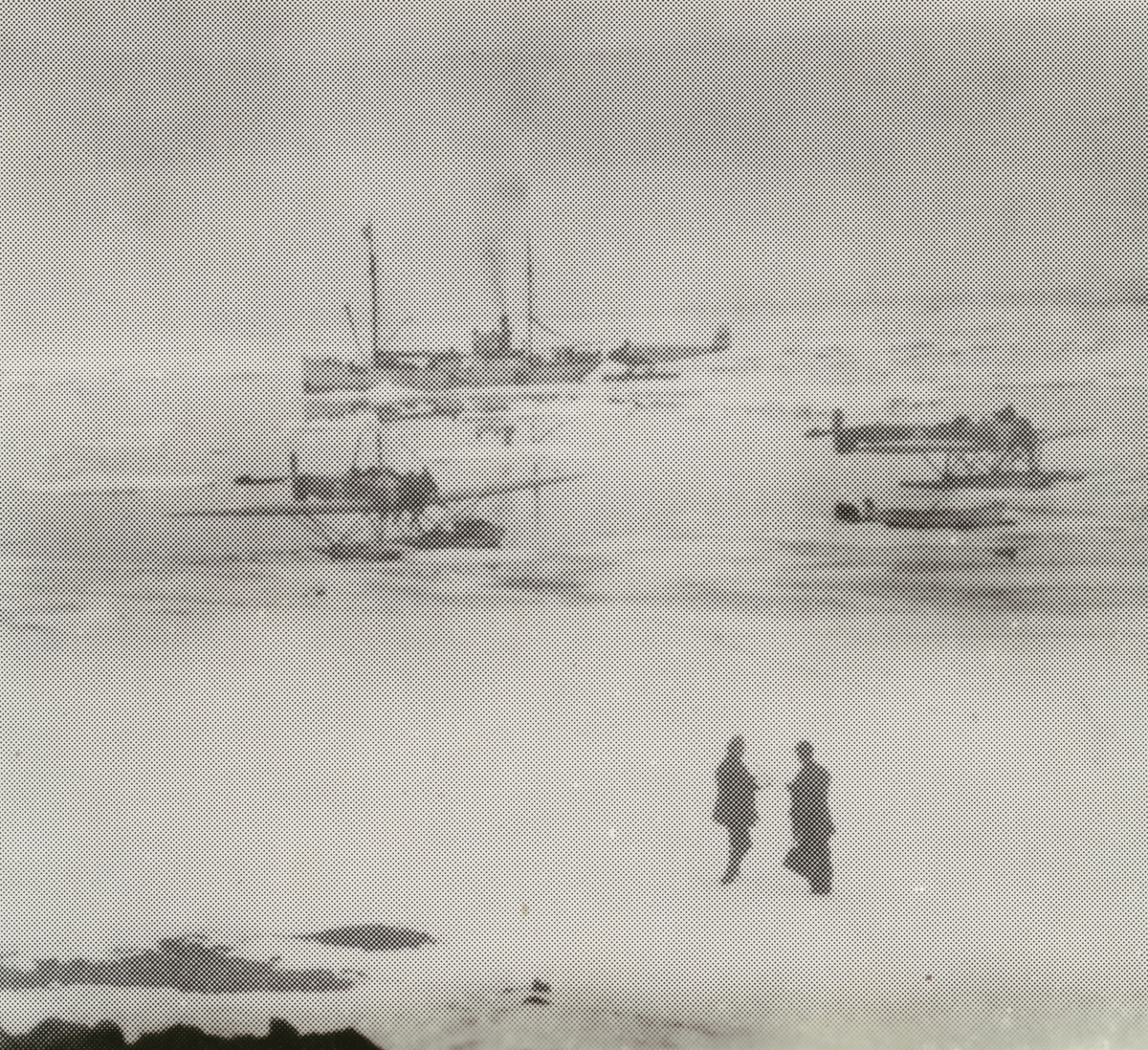 Fotografi från svenska undsättningsexpeditionen 1928. Motiv av två män i snölandskap framför flygplan och båt.