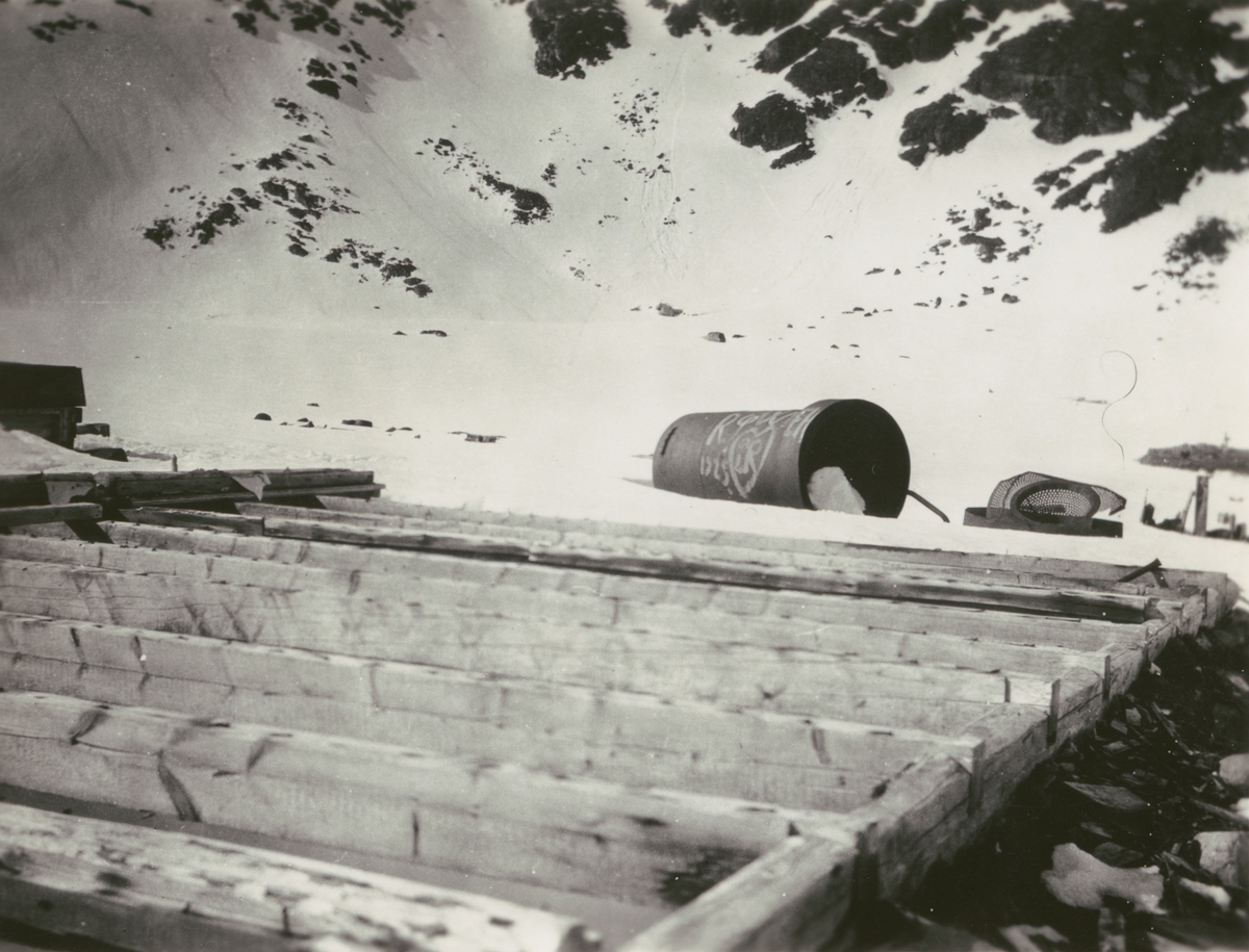 Fotografi från svenska undsättningsexpeditionen 1928. Motiv av rester från Andrées gasapparat i Virgohamna.